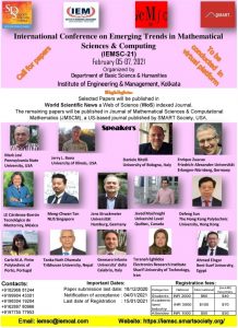 We cordially invite you to actively participate and present your research work in the 2nd International Conference on Emerging Trends in Mathematical Sciences & Computing (IEMSC-21), a Web-Conference, to be organized by the Department of Basic Science and Humanities, Institute of Engineering and Management, Kolkata from 5th-7th February, 2021. Please refer to the attached e-poster and the conference website: https://iemsc.smartsociety.org/ for further details.