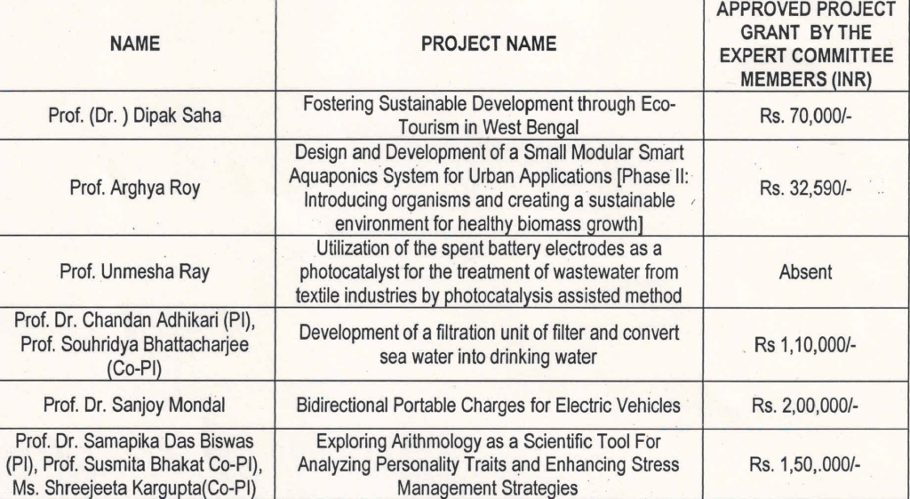 | Dr. Chandan Adhikari (PI). Prof. Souhridya Bhattacharjee (CO-PI) | Development of A Filtration Unit to Filter and Convert Sea Water into Drinking Water | Rs. 50,000/- |
