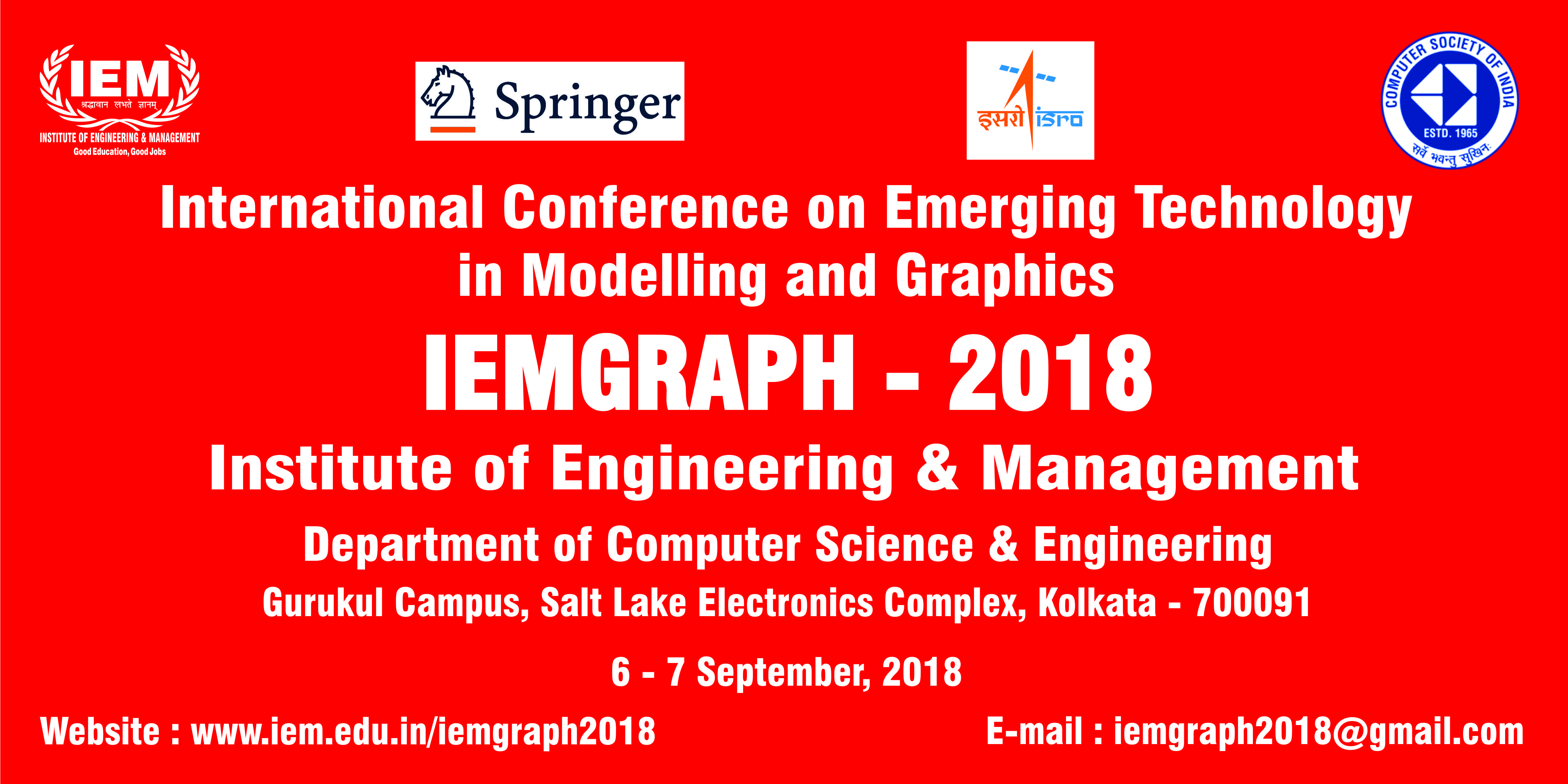 The 1st International conference IEMGraph 2018 – International Conference on Emerging Technology in Modelling and Graphics, will be held 6-7th September 2018 in Kolkata, India. The conference will include keynote talks, regular papers and poster communications. IEMGraph 2018 seeks outstanding papers describing contributions to the theoretical and practical aspects of image processing and graphical modeling of objects presented in images along with applications in this field. The proceedings of IEMGraph 2018 will be included in the Springer’s Advances in Intelligent Systems and Computing series (AISC).