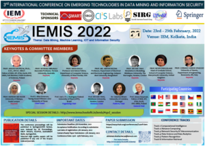 3rd INTERNATIONAL CONFERENCE ON EMERGING TECHNOLOGIES IN DATA MINING AND INFORMATION SECURITY (IEMIS 2020) which will be held at Institute of Engineering & Management, Kolkata, West Bengal. India on 23-25th February, 2022 will be organized by the School of Information Technology (Ashram Campus), a unit of Institute of Engineering & Management, Kolkata. This Conference will be a joint effort of the Institute of Engineering & Management (IEM) Saltlake. It is technically sponsored by The SMART Society, USA, Sciences and Technologies of image and Telecommunications (SETIT) Sfax University, Tunisia, Scientific Innovation Research Group (SIRG), Egypt, CI2S lab, Buenos Aires, Argentina and Scientific Research Group, Egypt.