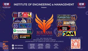 NIRVANA’ 21, a 3-DAY inter-college fest of Institute of Engineering & Management (IEM), Kolkata organized by the Department of Computer Application and Science is here with its 2nd edition. NIRVANA’21 is here with both technical and non-technical events to be held from 5th-8th July 2021 in Online. We welcome you to be a part of the family and witness the technical extravaganza.