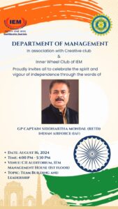 On 16th August, 2024, IEM-UEM Group had organized one AFERO. The IEM Department of Management was proud to organize the event to celebrate the spirit and vigor of independence through the words of GP CAPT SIDDHARTHA MONDAL (RETD) of Indian Air Force (IAF) on “Team Building and Leadership” on August 16, 2024, from 4:00 PM to 5:30 PM at the CII Auditorium, IEM Management House.