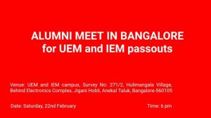 With immense eagerness to meet you all, we are organizing Alumni meet in our UEM and IEM campus at Bangalore on 22nd February 2020, 6PM onwards.