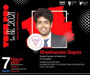 Tech Pro Talks was organized by IEM IEDC (Innovation and Entrepreneurship Development Cell)- Dept of Science and Tech Govt of India, in association with Institutions Innovation Council, IIC-IEM on March, 7, 2021. Speaker was Shashwata Gupta, Design Engineer, Qualcomm.