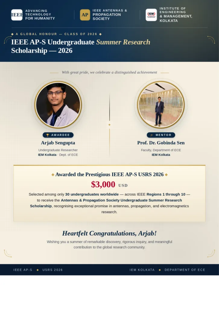 Arjab Sengupta, Undergraduate Researcher (Department of Electronics & Communication Engineering, IEM Kolkata), has been awarded the $3,000 USD IEEE Antennas and Propagation Society Undergraduate Summer Research Scholarship (USRS) 2026, selected among only 30 undergraduates worldwide across IEEE Regions 1–10. This highly competitive recognition highlights exceptional promise in antennas, propagation, and electromagnetics research.