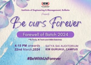 Farewell for Batch 2024 will be organised on 22nd March 2024 in Satya Sai Auditorium from 4.15P.M. onwards.Students are requested to come and join the event.