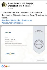 Congratulations to Prof. Dr. Soumi Dutta, Institute of Engineering & Management (IEM), Kolkata for her 10th foreign certificate from IEM’s Coursera account. She has shown how faculty and students gets the maximum learning opportunities from IEM-UEM and upgrade themselves.