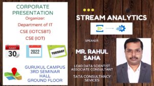 Mr. Rahul Saha, Lead Data Scientist Associate Consultant of TCS delivered a speech on STREAM ANALYTICS. The program was organized by the IEM IT department on the Ground floor, 3rd Seminar Hall of Gurukul Campus from 4 PM onward on 30th August 2022.