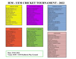 For the First time, a Cricket tournament was arranged for all Family members in IEM.6 teams participated in 29th January 2022 for the cricket tournament.6 teams were as follow: