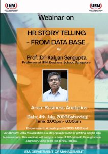 Department of Management, IEM presents webinar on “HR Story Telling- From Database” by Prof. (Dr.) Kalyan Sengupta, Professor at IFIM Business School, Bangalore on 4th July 2020 from 3pm to 6pm.