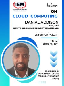 The department of CSE has organized a distinguished talk on Cloud computing on 26th February 2024.from 8.00 pm. The guest of the event was Mr. Danial Addison, CEO and CTO Health Blockchain Security service LLC, USA. Student and faculty members of the department have participated in this event.