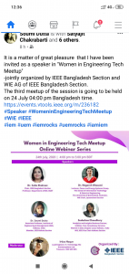 Dr. Soumi Dutta, assistant professor of Institute of Engineering & Management (IEM), Kolkata shared that she have been invited as a speaker in “Women in Engineering Tech Meetup”