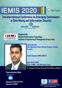 Dr. Thinagaran Perumal, Universiti Putra Malaysia, Malaysia will be delivering his keynote note in IEMIS 2020.