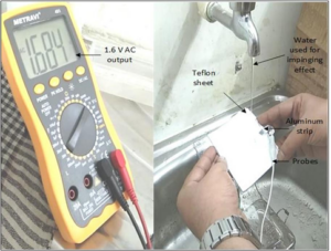 Research and development efforts are being carried out to harvest energy from water in the forms of rain, river tides, and ocean waves. Traditional power generation systems are inefficient and cost-consuming to achieve a high density of electrical energy. As an alternative, utilizing the triboelectric energy generation principle, a device comprising of three components: the upper electrode layer, polymer film (insulating layer), and the lower electrode layer is fabricated to harvest energy from impinging water droplets by using an architecture that comprises a polymer film (insulating layer) on a lower electrode layer plus an upper electrode layer. The impinged water droplet bridges the disconnected components into a closed-circuit electrical system on spreading. The water-droplet-based energy cell works following the principle of contact electrification and electrostatic induction between water droplets and polymer film (insulating layer).