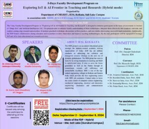 A 5-Day Faculty Development Program on “Exploring IoT & AI Frontier in Teaching and Research” (Hybrid Mode) was organized by the Department of CSE (IoT), Institute of Engineering & Management, Kolkata, in association with HRDC, IEM-UEM Group, IEM IQAC, and the IEM-IETE Students’ Forum. The program took place from September 2 to September 6, 2024.