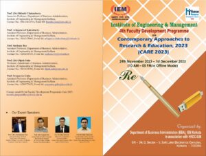 The BBA department of IEM is organizing the faculty development program on Contemporary Approaches on Research and Education from 24th November 2023 to 1st December 2023.