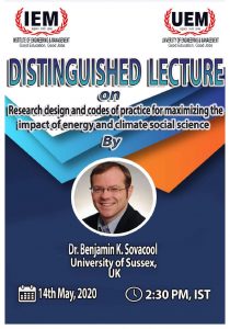 IEM-UEM organised a Distinguished Foreign Lecture – “Research Design and codes of practice for maximizing the impact of energy and climate social science”, by Dr. Benjamin K. Sovacool, University of Sussex, UK on May 14, 2020 2:30 PM IST