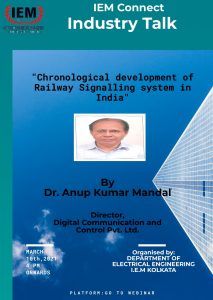 An Industry Talk was organized on 10th March,2021 by Electrical Engineering Department under IEMCONNECT event. The topic was Chronological Development of Railway Signaling System in India and the Speaker was Dr. Anup Kumar Mandal, Director Digital Communications and Control Pvt.Ltd.