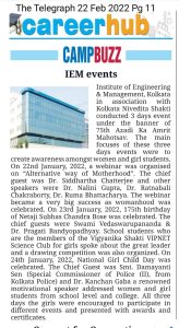 Institute of Engineering & Management in association with Kolkata Nivedita Shakti (KNS) organized 3days events in online mode. To remove gender inequality, to create awareness about girls’ rights & also inform people about girl’s education IEM an association with KNS celebrated ‘NATIONAL GIRLS CHILD DAY’ On 24th January 2022 in online mode. To pay tribute to Netaji Subhas Chandra Bose an online event was organized on 23rd January 2022 in online mode. To create an awareness among female faculty about Motherhood a special event was organized on 22nd January 2022. An alternative way of Motherhood helps all-female faculties to know something new.