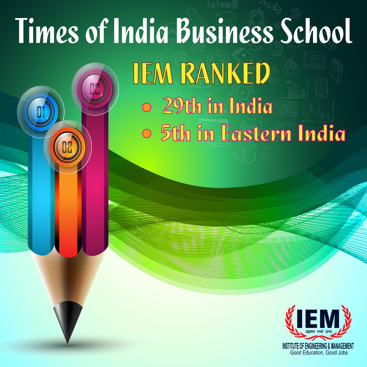 Institute of Engineering & Management ranked 29th in India and 5th in Eastern India among emerging Business Schools in the Times of India Business School Rankings. We take this opportunity to thank you all for your collaborations, support, cooperation and blessings.