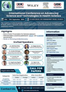 We are pleased to inform you that the Department of Basic Science & Humanities, Institute of Engineering & Management – Salt Lake (School of University of Engineering and Management, Kolkata, India) is organizing the first International Conference on Advancing Science and Technologies in Health Science (IEM-HEALS-24) from 13th-15th September 2024 to be held at CII Auditorium, Management House , D-1, Sector-V, Salt Lake, Kolkata 700091. We cordially invite you to submit abstracts, to be considered for poster/oral presentations at our conference.
