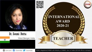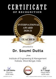 We wholeheartedly congratulate Prof. Dr. Soumi Dutta, Associate Professor, Dept. of BCA, Institute of Engineering & Management (IEM), for having received International Teacher Award 2020-21 from International Institute of Organized Research (I2OR), Ministry of MSME, Government of India.