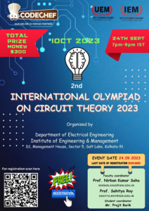 IOCT 2023 – International Circuit Theory Olympiad was organized on 24th September 2023 in virtual mode. This remarkable event witnessed the participation of 263 brilliant minds, including 31 talented individuals from various countries outside of India. A special thanks goes to Mr. S Kiran from Codechef, whose invaluable efforts and expertise ensured that IOCT 2023 was the first-ever Olympiad in our country, focusing on a non-coding and non-mathematics domain, conducted through the renowned Codechef platform.