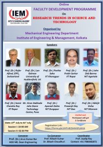 Online Faculty Development Programme (FDP) on “Research Trends in Science and Technology” organised by ME department of Institute of Engineering & Management (IEM), Kolkata from 27th to 31st July 2020.