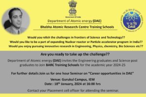 Department of Atomic Energy(DAE) invites all to join the BARC Training School For Academic Year 2024-2025.DAE in association with IQAC of IEM has organised the event on 18th JAnuary 2024 from 4.00pm in gurukul campus of IEM.