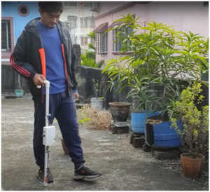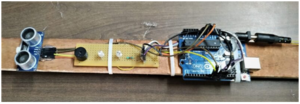 It is an Arduino based stick which uses ultrasonic sensors to warn a blind person of upcoming obstacles, it has GPS and GSM modules incorporated for emergency message calling and has water sensor to detect water.