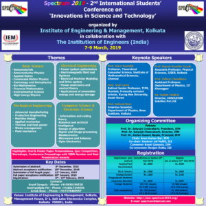 ‘Spectrum – 2019’ – 2nd International Students’ Conference on ‘Innovations in Science and Technology’- will be organized by Institute of Engineering & Management (IEM) in collaboration with The Institution of Engineers(India) from 7th – 9th March, 2019 at Management House, IEM, Kolkata, India.