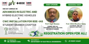 The Department of Electrical Engineering has opened one student branch chapter under the IEEE INDUSTRY APPLICATION SOCIETY (IEEE-IAS). On this occasion, on the 12th of August, 2024. An event was organized that began with CWC installation and was followed by a distinguished lecture talk on “Advances in Electric and Hybrid Electric Vehicles” under the IEEE IAS Banner. Our inaugural guest was Prof. Shib Sankar Saha (Chair, IEEE IAS KOLKATA SECTION), and the Distinguished Lecturer will be Prof. Sujit K Biswas (SMIEEE, former chair IEEE IAS) at the CII auditorium, IEM MANAGEMENT HOUSE.
