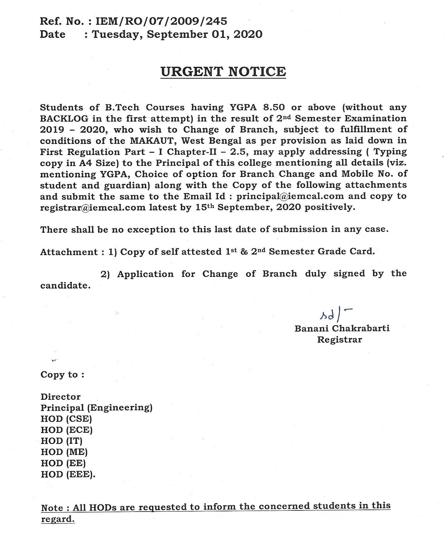 Notice for change of Branch